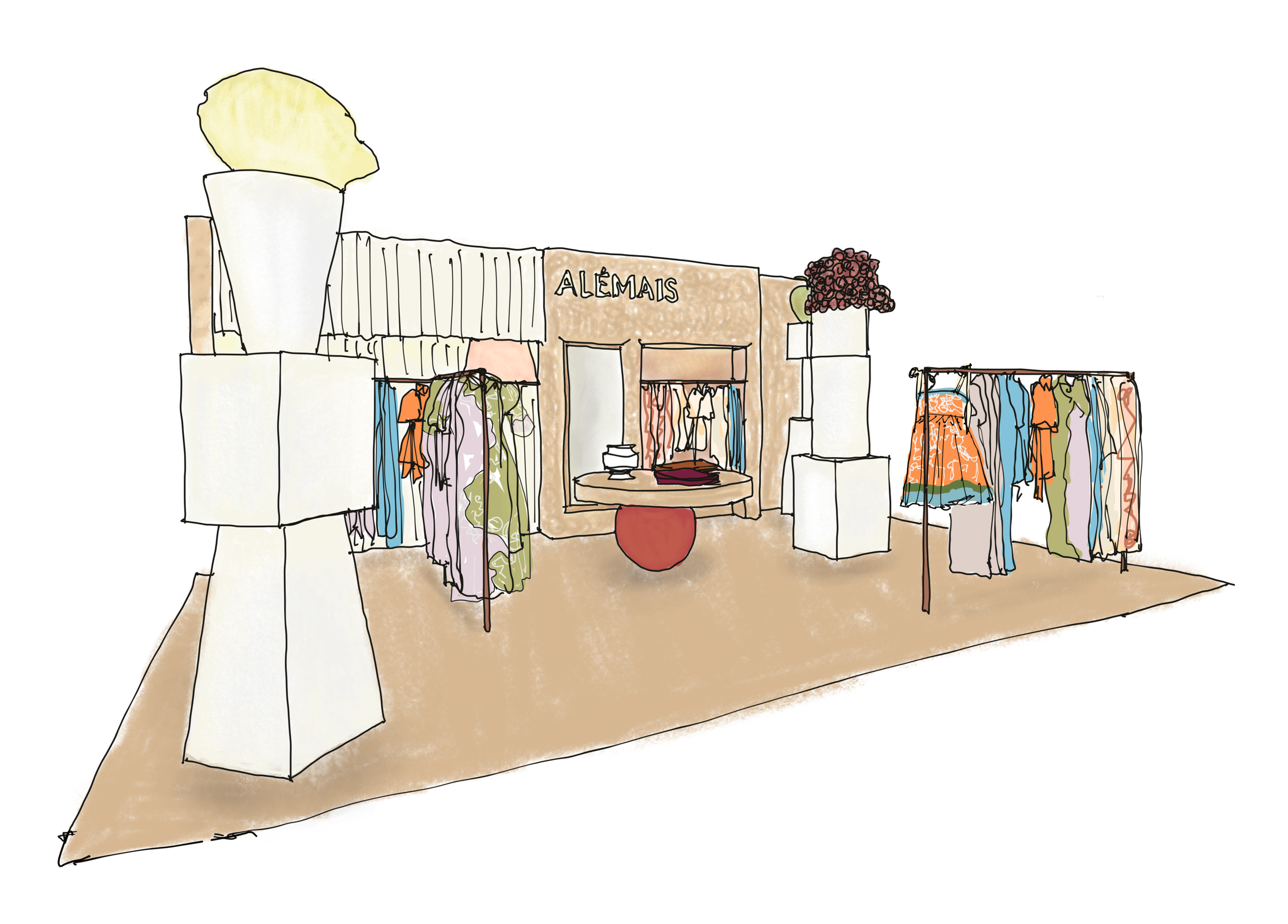 The installation interprets this narrative through a series of sculptural forms distributed throughout the space. Rendered structures reference traditional architectural columns, their geometry softened and abstracted into figures that appear almost in motion. Oversized textile elements introduce a sense of character and abundance.